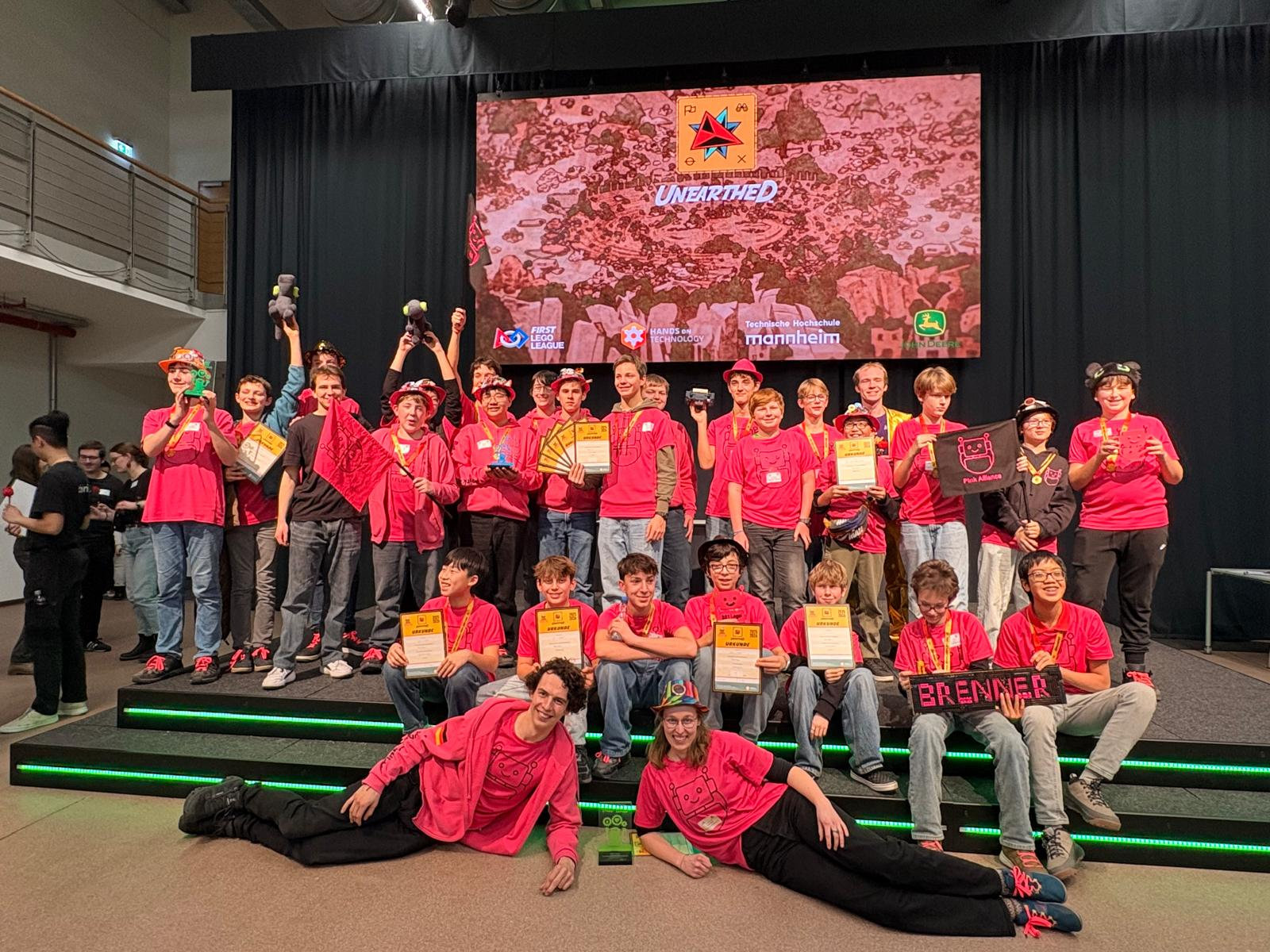 Mit 3 Teams und zahlreichen weiteren Schülern und Eltern als Unterstützung waren die pinken T-Shirts quasi omnipräsent auf dem Wettbewerb – die Jury war sich teilweise gar nicht mehr sicher, ob denn alle Teammitglieder vor ihnen stehen oder ein Teil nicht noch im Publikum sitzt. Das Zusammengehörigkeitsgefühl über die Teams hinweg zeigte sich schon in der gesamten Vorbereitung und war auch am Wettbewerbstag nicht zu übersehen – bzw. beim gegenseitigen Anfeuern zu überhören. Und sicherlich war es auch ein Schlüssel zum Erfolg – denn auch Auszeichnungen durften die Teams wieder einige mit nach Hause nehmen: DI3_BUN53NBR3NN3R belegten auch in den Robot-Game Finals den 5. Platz. Für 3, 2, 1, LEGO! gab es erneut Nominierungen in den Kategorien Roboterdesign und Grundwerte und sie durften sich einmal mehr über den Pokal für die beste Forschung freuen! In der Gesamtwertung verpassten sie als 3. nur um Haaresbreite die Qualifikation für die nächste Runde. FFLish räumte wieder einmal voll ab: Neben den Nominierungen in den Kategorien Forschung und Roboterdesign durften sie den Pokal für das beste Robot-Game mit nach Hause nehmen. Als FLL Champion qualifizieren sie sich gemeinsam mit StrgR für den Quali-Wettbewerb in Rockenhausen am 5. März! Und Coachin Filippa Piazolo wurde mit dem Coachin-Award ausgezeichnet! Herzlichen Glückwunsch!